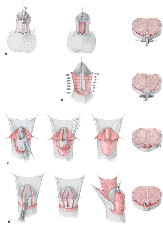 Fig. 6 a - d: Use of ventral skin distal to the meatus to reconstruct a partially epithelialised neourethra: (a) Duplay incomplete urethroplasty (1880); (b) Denis Browne technique (1949); (c) hinging of the urethral plate (Rich et al. 1989); (d) Snodgrass TIP urethroplasty (1994). | |||||||||||||||||||||||||||||||||||||||||||||||||||||||||||||||||||||||||