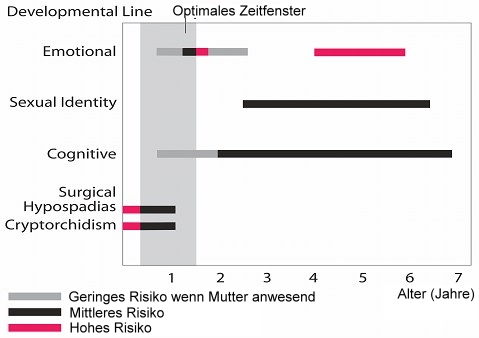 Gegenüberstellung der Risiken einer Hypospadie-Korrektur in Abhängigkeit vom Alter. Das optimale Zeitfenster liegt zwischen dem 3. - 18. Lebensmonat (modifiziert von Schulz et al., 1983). | |