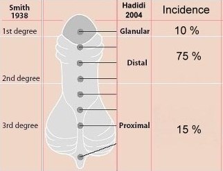 4. When should we seek medical advice? Because the optimal window for hypospadias-correction is between 3 and 18 month it is ideal to seek the adivce of an experienced specialist during the first 3 month of life. 5. Which specialist should we contact? A pediatric surgeon, urologist or plastic surgeon? It is not important the speciality of the surgeon, what is more important is that he is interested in hypospadias and has large experience in hypospadias and has good results. In fact some of the world pionieers who have contributed a lot to the field of hypospadias were pediatric surgeons, others were urologists or plastic surgeons. 6. How can I identify the severity of hypospadias of my child? There are several factors that determines the severity of hypospadias. However as a general rule: if the opening is in the glance this is considered mild degree or grade 1. If the opening is in the outer half of the penis this is considered a moderate degree or grade 2. If the opening is in the inner half of the penis or in the scrotum, this is considered severe degree or grade 3. Please see examples below. In reality the actual position of the meatus and the kind of the technique that is suitable for the child and the degree of curvature can not be accurately decided except in the operating theatre when the child is asleep. Mild or moderate degrees of hypospadias constitute about 85 % of hypospadias. Severe forms constitute only 15 %. |