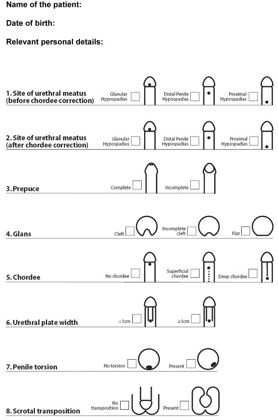 1) Urethral mobilisation a) Urethral mobilisation first described by Beck and Hacker (1897). b) MAGPI described by Duckett (1981, midline vertical incision closed transversely and mobilization). c) M configuration by Arap (1984), a modification of MAGPI by placing two sutures on the ventral edge. d) UGPI modification of MAGPI by Harrison and Grobelaar (1997) by having a V-shaped incision around the original meatus, and having deep glanular wings before urethral advancement and upward rotation of the glanular wings. 2) Skin distal to the meatus A) Use of ventral skin distal to the meatus to reconstruct a completely epithelialized neo-urethra a) U-shaped incision as first described by Thiersch (1869). Notice the U incision is not central to avoid suture lines on top of each other. b) Pyramid repair by Duckett and Keating (1989) for Megameatus Intact prepuce (MIP). c) glanular hypospadias with cleft glans. d) DUG repair by Stock and Hanna (1997) combining U-shaped incision with vertical midline incision closed transversely. B) Use of ventral skin distal to the meatus to reconstruct a partially epithelialized neo- urethra (Fig. 6) a) Duplay incomplete urethroplasty (1880) b) Denis Browne technique (1949) c) Rich et al (1989) hinging of the urethral plate d) Snodgrass Tubularized Incised Plate (TIP) urethroplasty (1994) 3) Skin proximal to the meatus a) Wood (1875) described meatal based flap with button hole of prepuce b) Omberdanne (1911) repair, a large round flap, and a purse string suture c) Mathieu repair (1932), a U-shaped incision and two suture lines d) Mustarde repair (1965), a rectangular flap and one suture line e) Barcat balanic groove technique (1969), and a deep midline incision f) Hadidi (1996) Y-V glanuloplasty modified Mathieu. A Y incision in the glans, the center at the tip of glans, closed as a V and "dog-ears" opened. A small V is excised from the distal end of the flap. 4) Preputial skin a) Button holing of the prepuce described by Thiersch (1869). b) Midline incision of the prepuce described by Edmunds (1913) and Byars (1955). c) Preputial skin as a skin graft to cover the ventral defect of the penis described by Nove- Josserand (1897) and Bracka (1995). d) Preputial skin as a free skin graft to form the neo-urethra described by Devine and Horton (1961). e) Preputial Island Flap as described by Hook (1896), and Duckett (1980). f) Onlay Island Flap as described by Elder (1987). g) Preputial vascular fascia as a second protective layer described by Retik (1988). | |||||||||||||||||||||||||||||||||||||||||||||||||||||||||||||||||||||||||